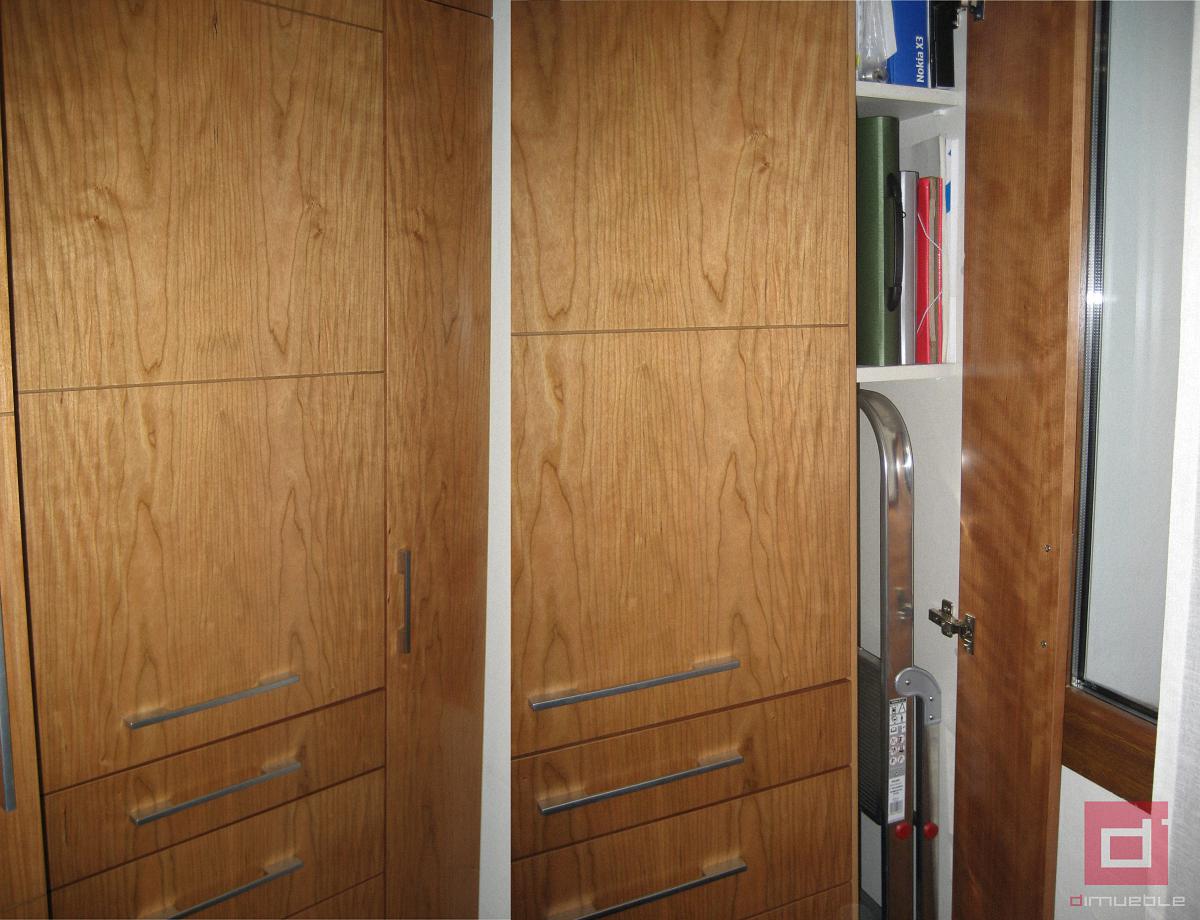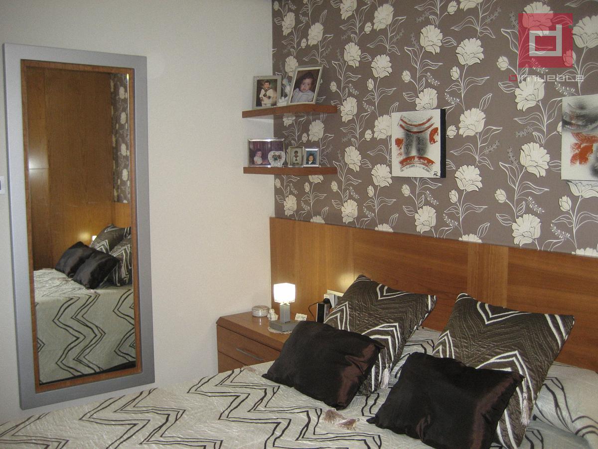 A modo de complemento se instalaron un par de estanterías de pared y un espejo vestidor, combinando la enmarcación de éste en un lacado aluminio a juego con los tiradores sobre un fondo en cerezo.